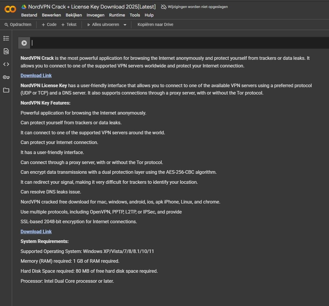In the image above, we can see a search result for a purported software crack for the virtual private network (VPN) product NordVPN. When a user clicks the search result, they are routed to a Google Colab development environment with a "Download Link" button.
