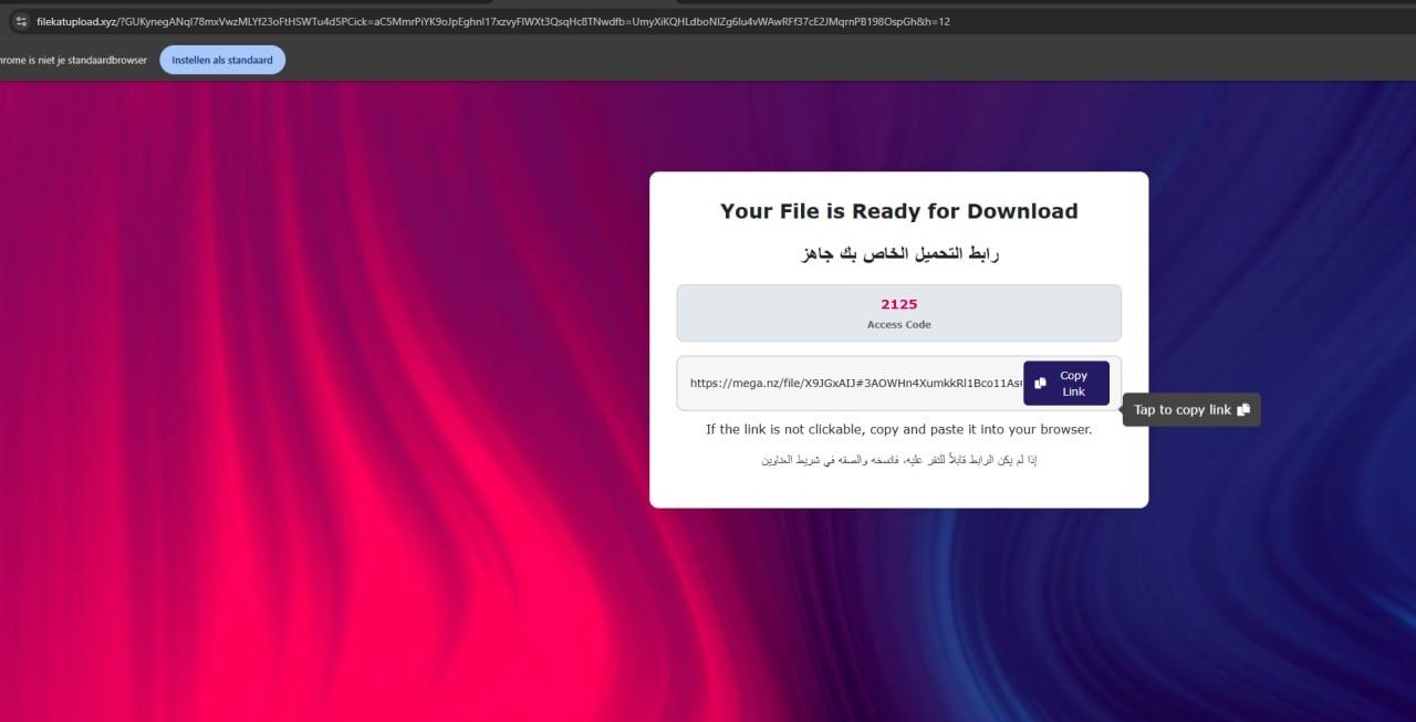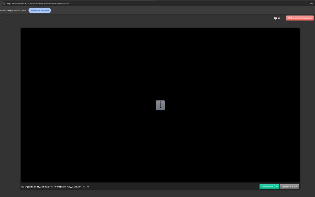 Pressing that button opens an intermediary page instructing the victim to copy and paste a MEGA URL into the browser. Following this link finally accesses the MEGA page hosting a .tar archive (see two figures below).