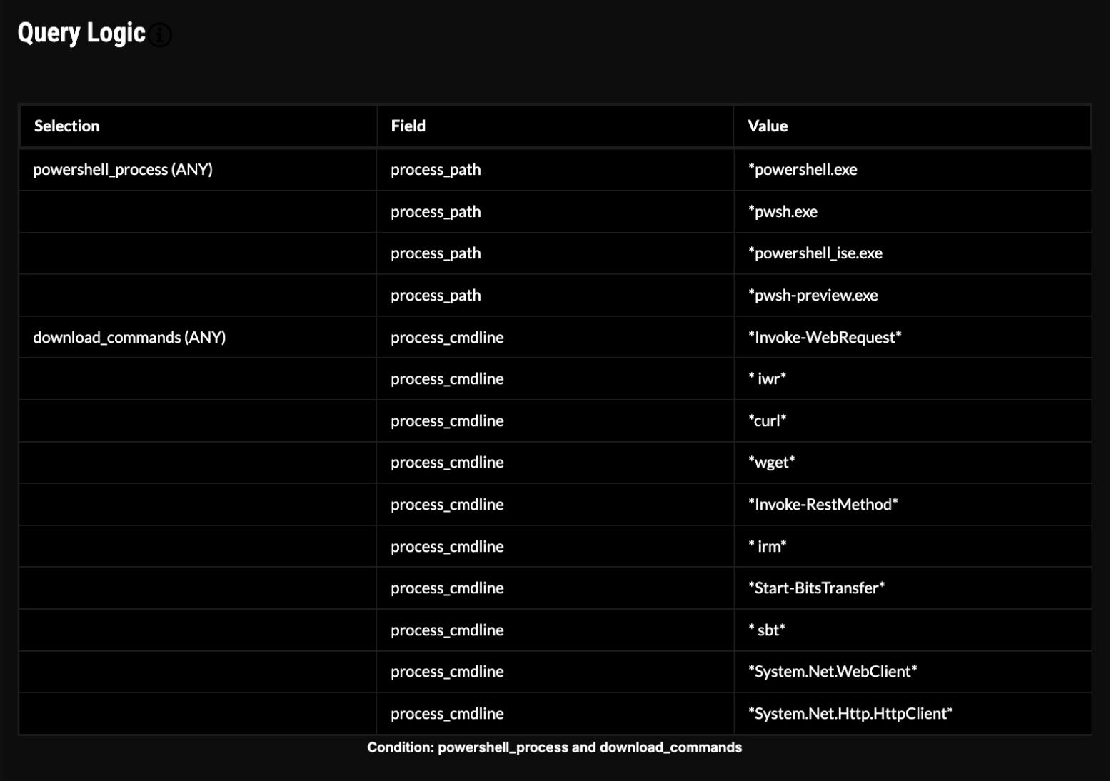 Let’s look at the query logic (see: image below). This contains the key-value or field-value relationships that we will be hunting. The logic includes any command line or executable paths that invoke values related to PowerShell or are associated with remote downloads.