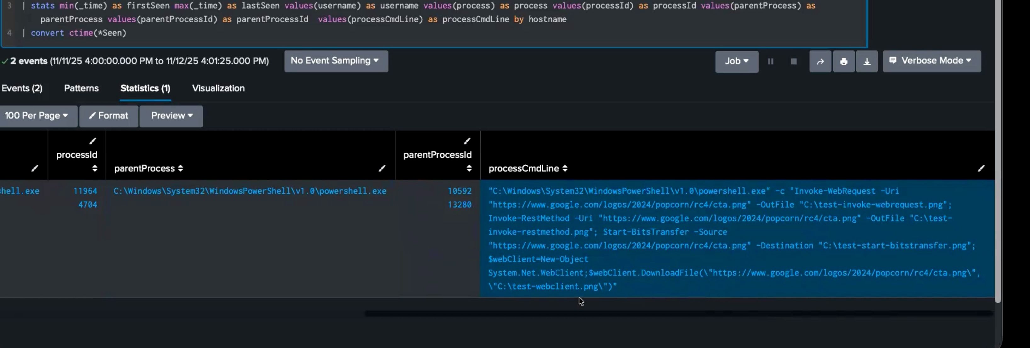 The result shows the PowerShell command reached out to a Google domain for a portable network graphic (.png) file. From here, the investigation can be taken in different directions, such as checking network and domain name system (DNS) logs to see if the domain was contacted. Another direction would be to check file-create logs in Windows Event Logs to see if this file actually landed in the directory shown in the script.
