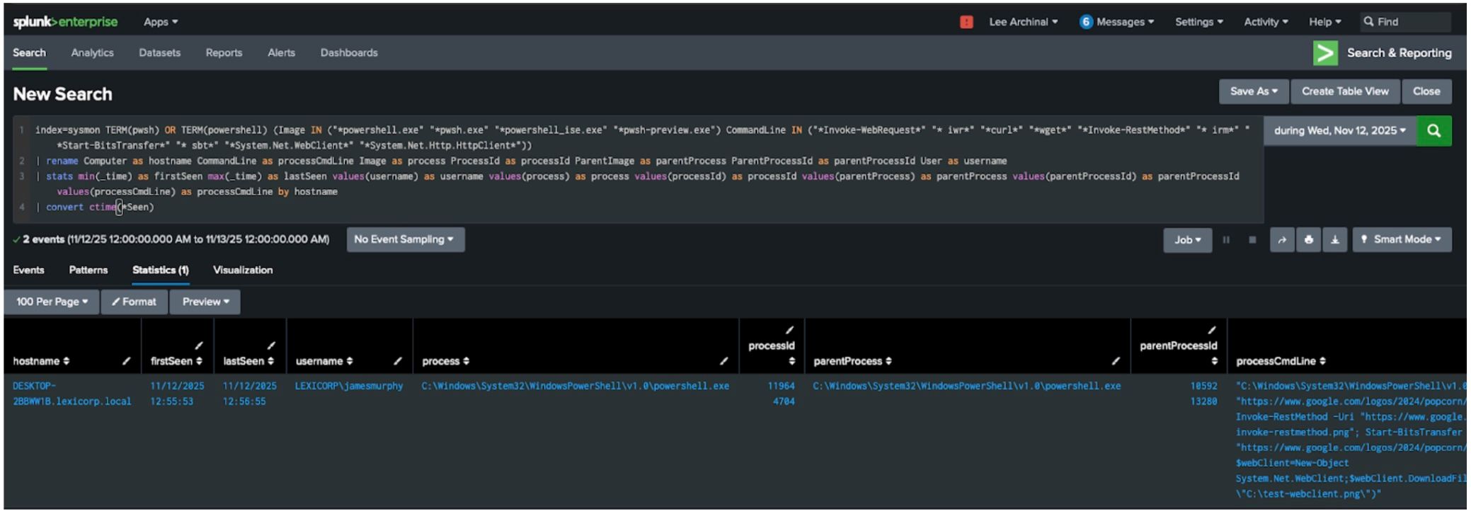 The result shows the launch of a PowerShell process and parent process. That’s not enough evidence of a compromise just yet, but we can aggregate the data to collect more artifacts to hunt. The results show this behavior was first seen and last seen on this specific host and only run once. The process was powershell.exe and the parent process was PowerShell. Then we can see the command-line arguments, and this is where the hunt becomes very interesting.
